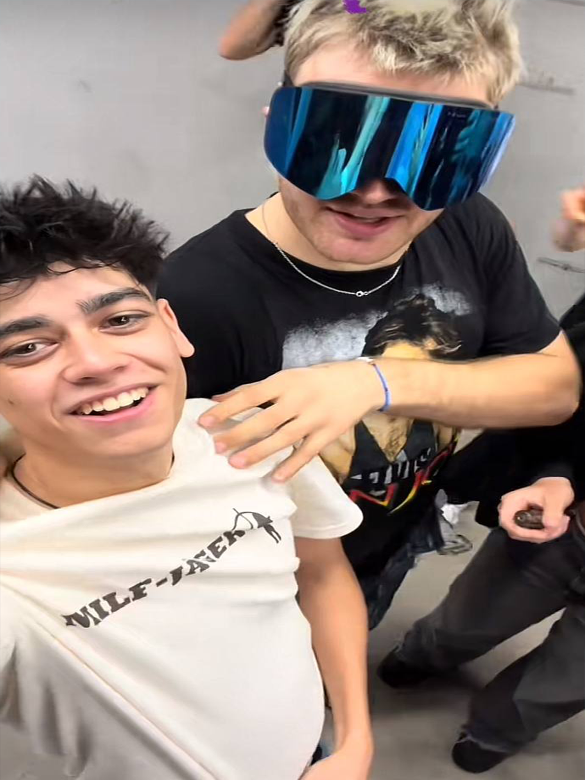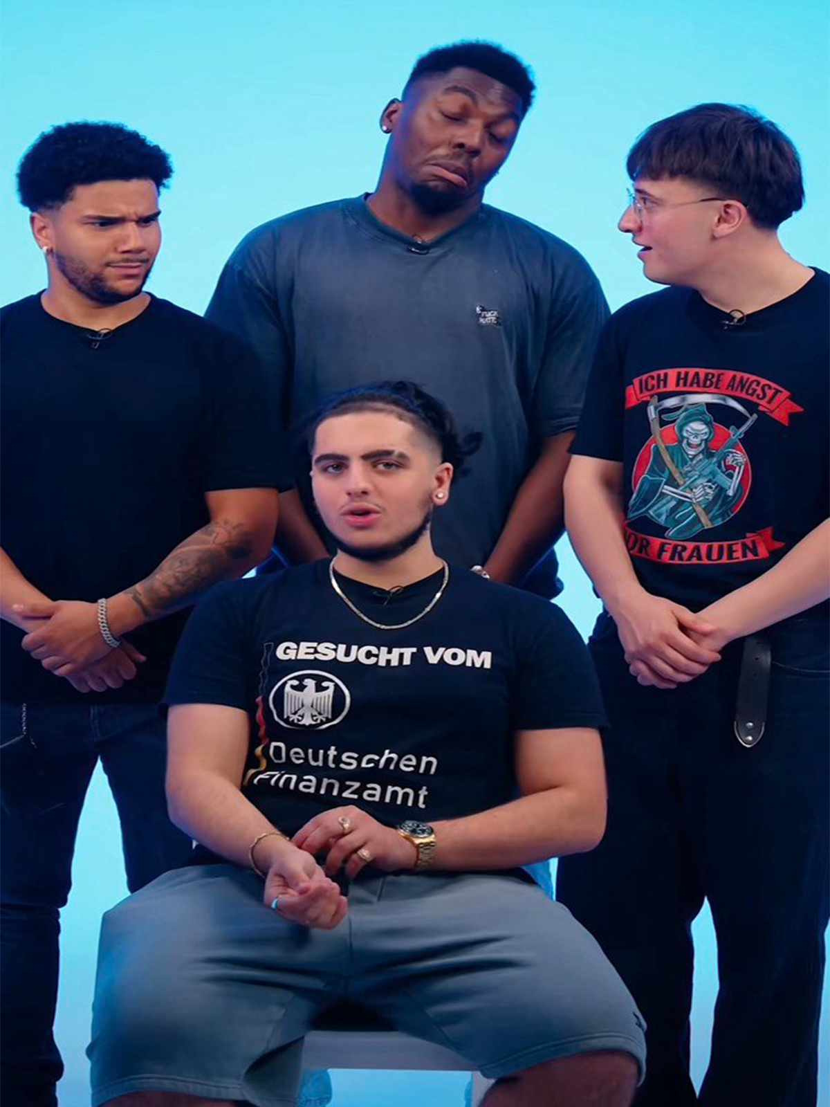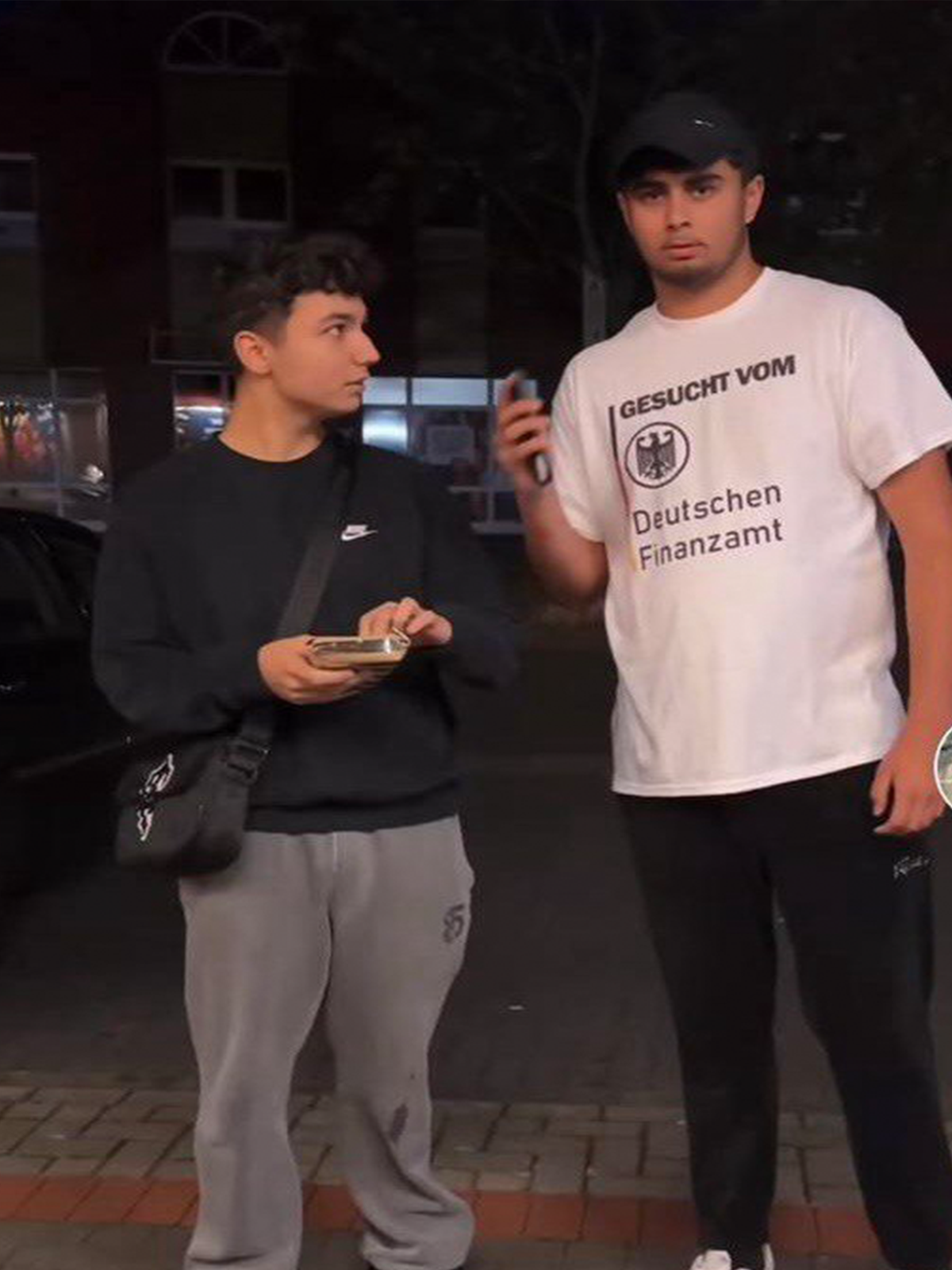 Hier tragen die bekannten TikToker Issa.hbc und Emirmono unsere T-Shirts 'Gesucht vom Finanzamt' und 'Ich habe Angst vor Frauen' in der TV-Show Brudi.