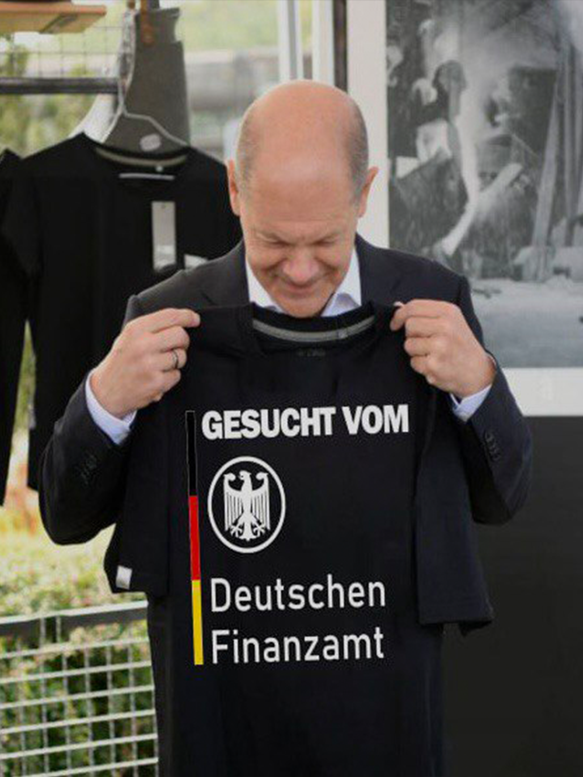 Sogar Olaf Scholz zeigt Stilbewusstsein! Der Kanzler hält unser 'Gesucht vom Finanzamt' T-Shirt in die Höhe – vielleicht ein subtiler Hinweis auf die nächste Steuerreform?